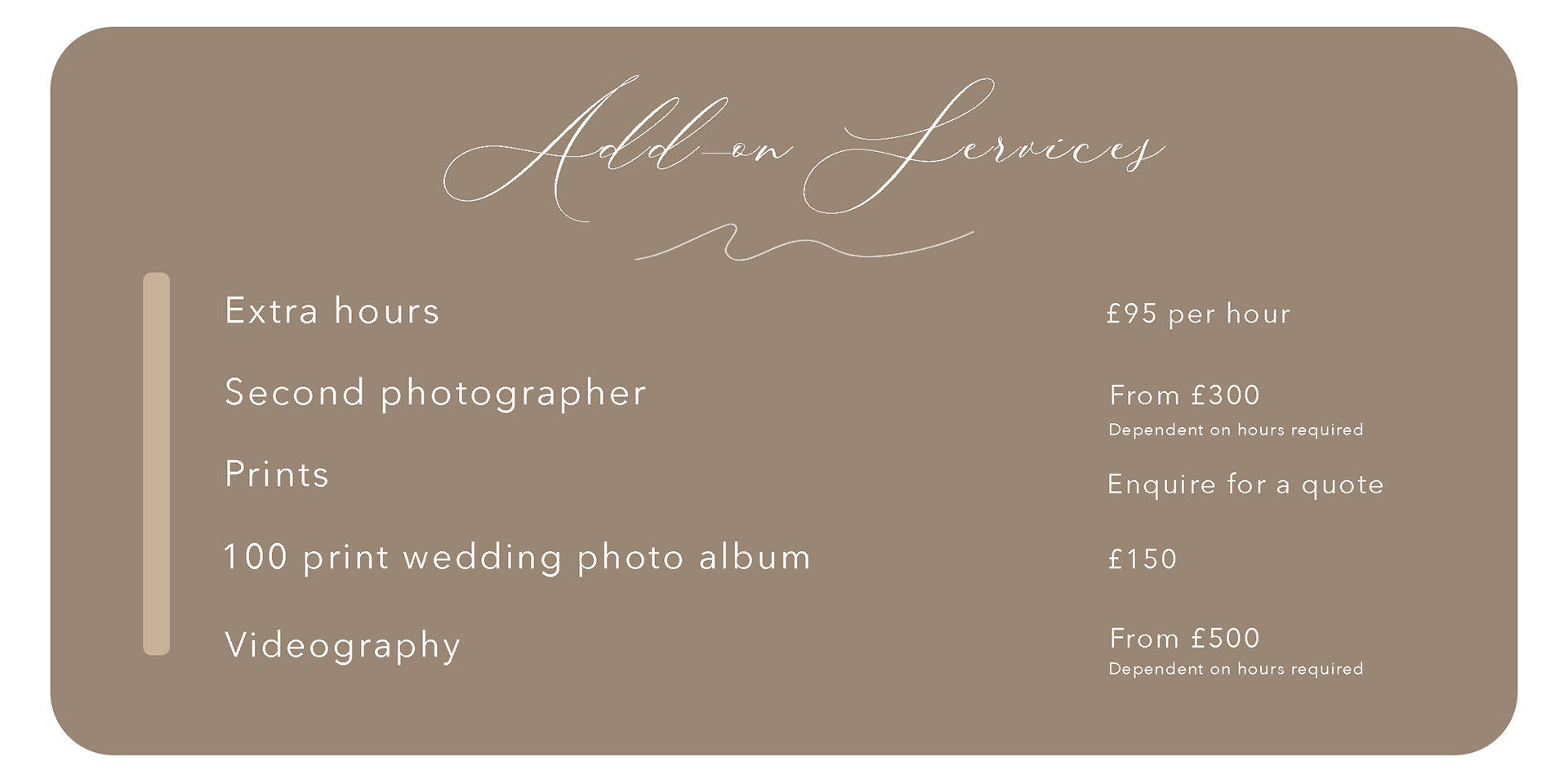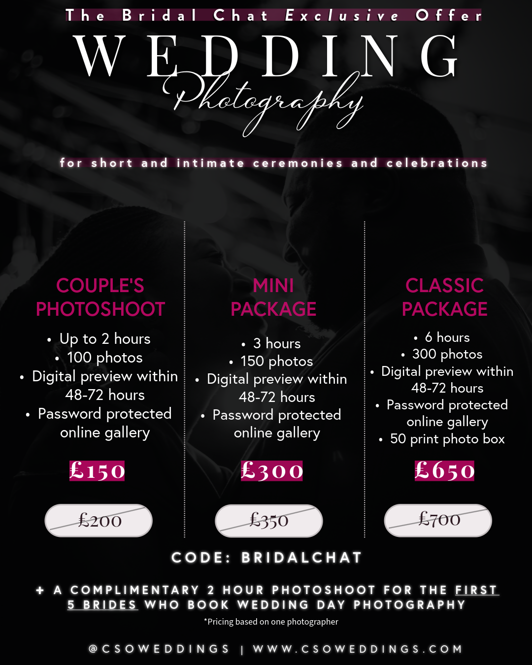 When you book with CSO, you're investing in more than just photos. Our pricing reflects the experience and skills brought to each shoot, the time spent both during the session and editing your images to perfection, as well as travel expenses within London. It also covers necessary business fees, plus the cost of printing your photos and any products included in your package. Every detail is handled with care to ensure a seamless experience from start to finish.